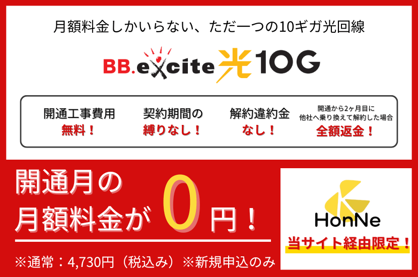 - BB.excite光 10G:月額料金のみで利用できる光回線【当サイト経由の限定キャンペーンあり】