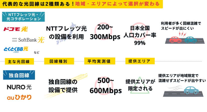 光回線は大きく分けて、「NTT回線」と「独自回線」の2種類があります。