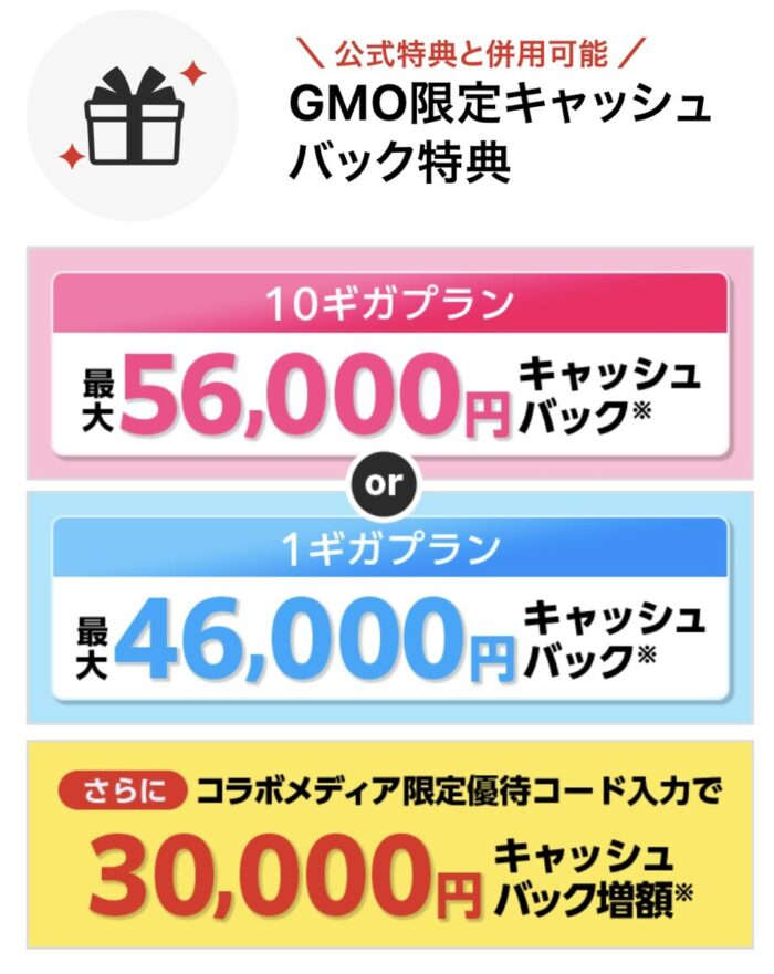 | 10ギガの全員対象特典 | 当サイト限定70,000円 | 通常25,000円 |