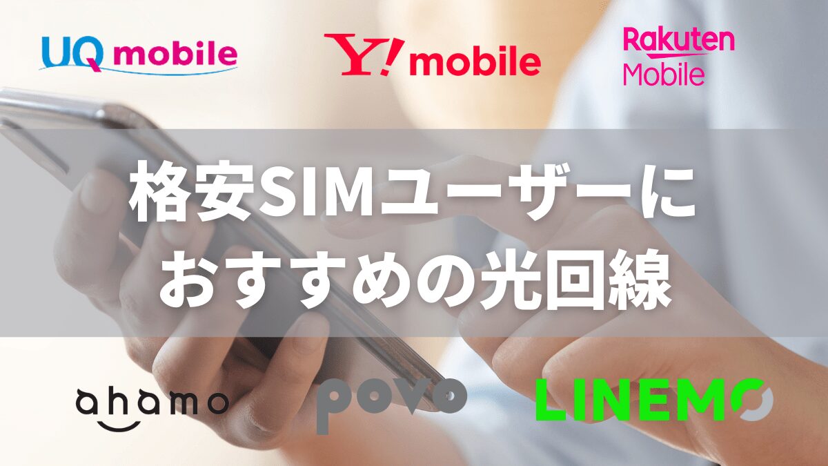 自宅のインターネット回線を契約したいけど、格安スマホ・格安SIMを利用中で、どの光回線がセット割引で安い組み合わせになるのかわからない方は多いのではないでしょうか。格安スマホ・格安SIMによって、スマホとのセット割引が適用できる光回線サービスの組み合わせは限定されます。格安スマホ・格安SIMとセットで安くインターネット回線を使うには、セット割が適用できなくても、実質月額料金・総額費用が安い光回線を申し込むか、事前にしっかり調べて毎月セット割引の対象になる光回線サービスを契約するのがおすすめです!格安スマホ・格安SIMとの組み合わせでおすすめの光回線の情報を以下の表にまとめました。 利用中の格安スマホ・格安SIMおすすめの光回線セット割の割引額 月額料金 実質月額料金キャッシュバック金額 詳細へなし 戸建て:円マンション:円 戸建て:円マンション:円 最大円 詳細へ最大1,100円(※1) 戸建て:円マンション:円 戸建て:円マンション:円 最大円 詳細へ最大1,650円(※2) 戸建て:円マンション:円 戸建て:円マンション:円 最大円 詳細へ1000ポイント還元 戸建て:円マンション:円 戸建て:円マンション:円 なし トクトクプラン2、トクトクプラン、ミニミニプランの場合 シンプル2 M/Lの場合本記事では、UQモバイル・ワイモバイル(Y!mobile)・楽天モバイル・ahamo・LINEMO・povoなどの格安スマホ・格安SIMユーザーにおすすめの光回線を紹介します。2025年12月最新で契約・乗り換えにおすすめの光回線サービスをぜひ確認ください。 ahamo・LINEMO・povoなどのセット割が適用できない格安スマホ・格安SIMユーザーにおすすめ! 実質月額料金が最安級の「GMOとくとくBB光」は、契約期間の縛りや違約金がなく、工事費無料&最大円キャッシュバックのキャンペーン中!格安SIMユーザーにもおすすめの光回線です。 当サイト限定クーポンでキャッシュバック増額中 GMOとくとくBB光 詳細をみる さらに記事前半では、格安スマホ・格安SIMユーザーにおすすめの光回線の選び方を解説。すぐに、ご利用中の格安スマホ・格安SIMに最適な光回線サービスを知りたい方は、以下のボタンから該当箇所へスクロールできます!格安スマホ・格安SIM別のおすすめ光回線一覧 ※記事内の金額はすべて税込表記です。※本記事は掲載時点の情報であり、最新のものとは異なる場合がありますので予めご了承ください。格安スマホ・格安SIMユーザーにおすすめ!光回線の比較ポイントを解説格安スマホ・格安SIMユーザーにおすすめの光回線の比較ポイントについて解説します。格安スマホ・格安SIMとセットで光回線を契約するなら、下記の方法で選ぶのがおすすめです。 ネット・スマホのセット割引を利用できる光回線を選ぶ スマホセット割引がない場合は実質月額料金が安い光回線を選ぶ ネットとスマホのセット割引で毎月安く利用できる光回線を選ぶ光回線をお得に契約するなら、割引特典を比較して安い光回線を選ぶのがおすすめ。UQモバイル・ワイモバイルなどの格安スマホ・格安SIMを利用中なら、ネットとスマホのセット割引特典を利用して光回線を安く契約できおすすめです。格安スマホとの組み合わせでおすすめの光回線の情報を以下の表にまとめました。 利用中のスマホキャリアおすすめの光回線セット割の割引額 実質月額料金 月額料金キャッシュバック金額 詳細へ最大1,100円 戸建て:円マンション:円 戸建て:円マンション:円 最大円 詳細へ最大1,650円 戸建て:円マンション:円 戸建て:円マンション:円 最大円 ネットとスマホのセット割引がなくても実質月額料金がお得な光回線を選ぶahamoやLINEMOなど、光回線とのセット割引キャンペーンがない格安スマホ・格安SIMユーザーは、スマホとネットのセット割引がなくても実質月額料金が安い光回線を選ぶと、インターネットを安く利用できおすすめです。ahamo、LINEMOなどの格安スマホ・格安SIMユーザーは、キャンペーンも含めた総額費用・実質月額料金(※)での光回線比較がおすすめ。 ※実質月額料金とは、ネット契約期間中の費用総額から、割引・キャッシュバックキャンペーン特典を引いた支払い料金を、契約月数で割った平均月額料金です。 格安SIMでセット割がないと悲観せずとも、単体で安い光回線を選ぶことで、月額の固定費を大きく下げられます。当サイトが光回線サービスの実質月額料金を比較した結果、ahamoなどの格安スマホ・格安SIMユーザーにおすすめの光回線はGMOとくとくBB光!当サイト限定クーポンを適用した新規契約円キャッシュバックや、工事費無料キャンペーンの適用で、戸建ての場合は実質月額料金3,799円、マンションの場合は実質月額料金2,645円で利用でき、セット割がない格安SIM・格安スマホユーザーにおすすめの光回線です。GMOとくとくBB光の詳細までスクロール 【戸建てプランで最安級】月額料金が安いBB.excite光 10G格安SIMでセット割がない場合は、基本月額料金が安い光回線を選ぶことで、月額の通信費を安くすることができます。BB.excite光 10Gは