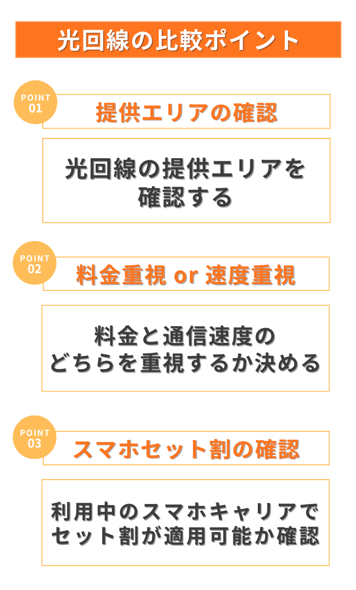 光回線選びで失敗しないためには、月額料金や通信速度、提供エリア、スマホとのセット割といった項目をしっかり比較し、自分に合ったサービスを選ぶことが重要です。
