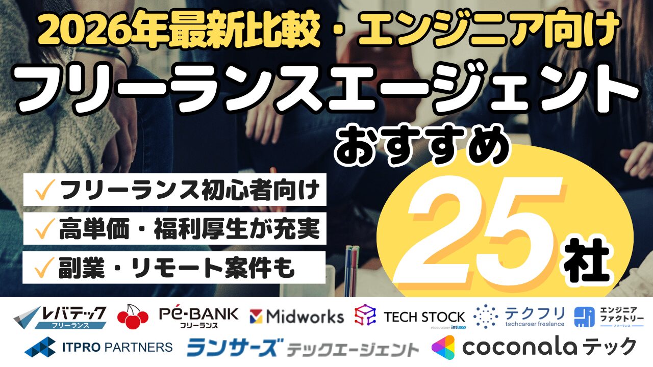 この記事ではフリーランス・個人事業主として働くITエンジニアやエージェント各社への取材をもとに、サービスの選び方や比較ポイントを解説。求人案件数やサポート内容、利用者の評判・口コミを比較し、フリーランスエンジニアにおすすめのエージェント25社を2026年3月最新情報で解説、ランキングで紹介します。
