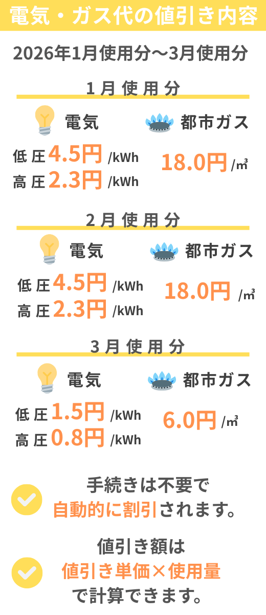 政府は、物価高騰による国民の負担を軽減するため、2026年1月、2月、3月使用分の電気・ガス料金に対して、電気代補助金による値引きを実施します。