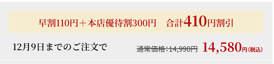 また、通販おせちの中には、早割やクーポンでお得に購入できるものもあります。おせちの早割は12月中旬頃までの購入で適用されることが多いため、お得に購入したい方は早めに注文しておきましょう。