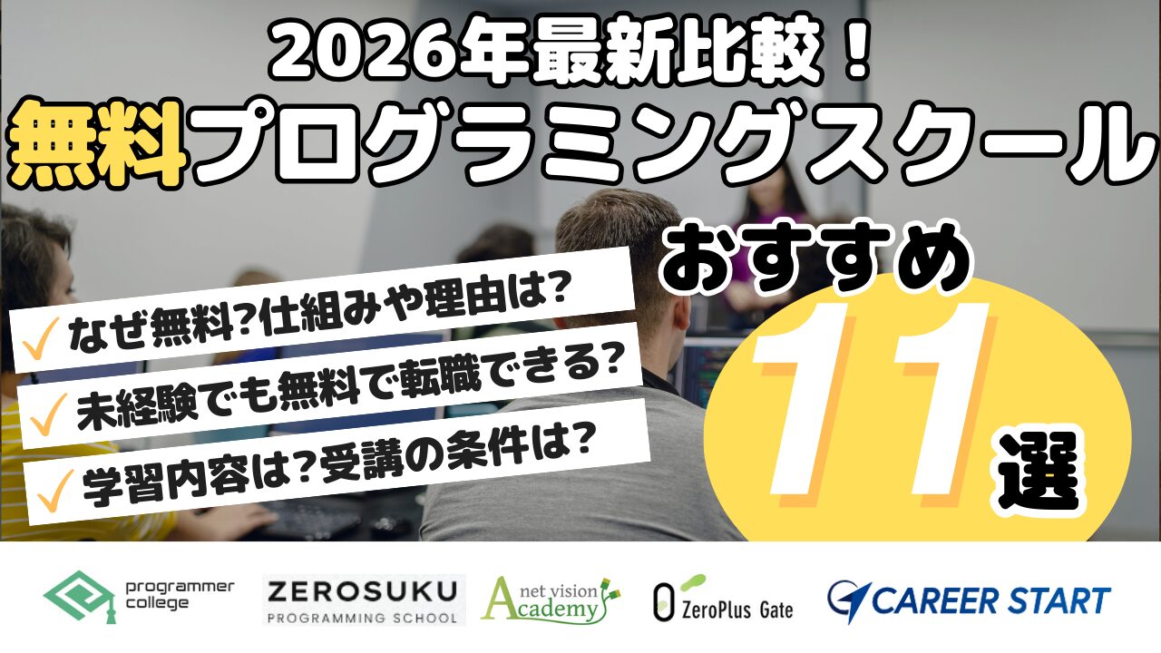 この記事では、ITエンジニアとしての就職・転職などを目的にプログラミングを学習したい方向けに無料スクールを比較。なぜ受講料金が無料なのかの仕組みや注意点も解説し、おすすめの無料プログラミングスクールを2026年2月最新情報で紹介します。また給付金制度を利用、安い料金で学べるスクールや無料のプログラミング学習サイトも紹介します。
