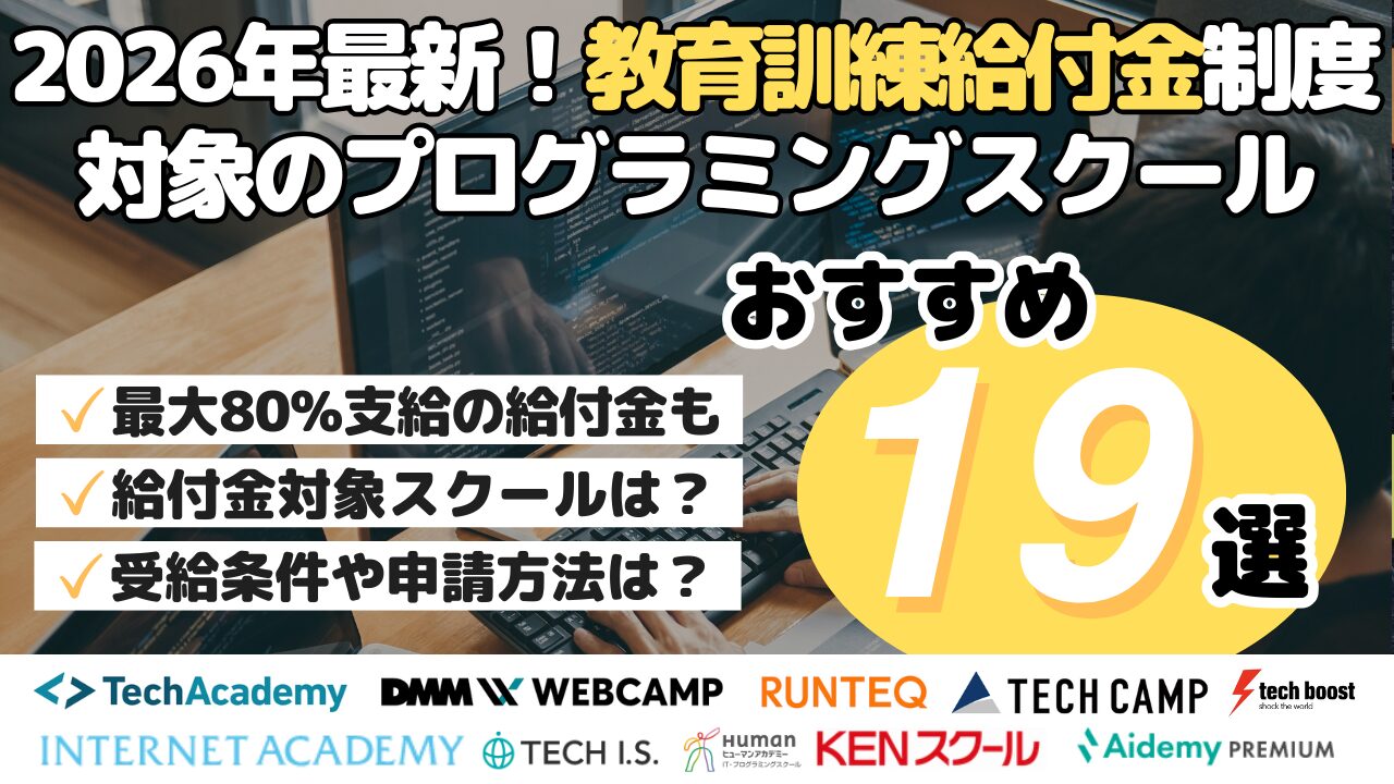 この記事では、教育訓練給付金制度を利用できるプログラミングスクールの選び方や受給資格の確認方法、申請方法を徹底解説。転職支援や転職保証付きのスクールなど、教育訓練給付金制度を利用可能なおすすめのプログラミングスクール19選について、2026年1月の最新情報で各スクールの特徴や学習内容を紹介します。