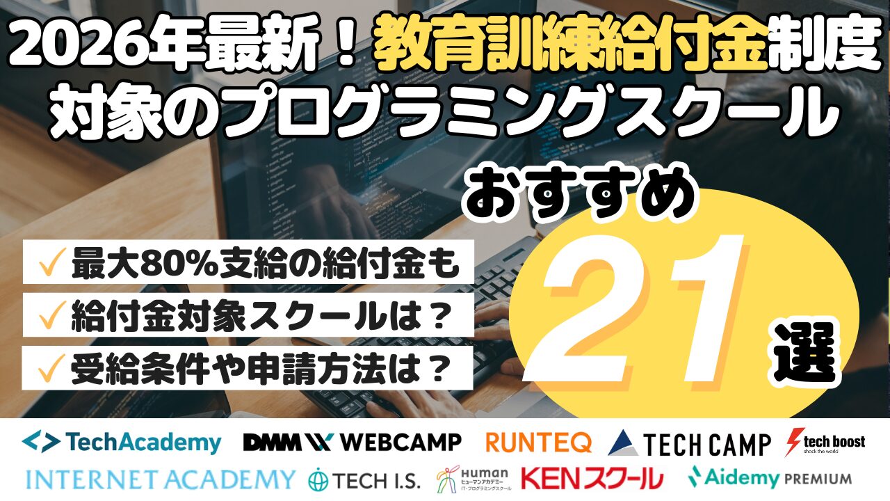 この記事では、教育訓練給付金制度を利用できるプログラミングスクールの選び方や受給資格の確認方法、申請方法を徹底解説。転職支援や転職保証付きのスクールなど、教育訓練給付金制度を利用可能なおすすめのプログラミングスクール21選について、2026年2月の最新情報で各スクールの特徴や学習内容を紹介します。