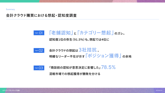 - ・調査結果:会計クラウドにおけるBtoB購買プロセスにおける「想起」の影響度に関する実態調査